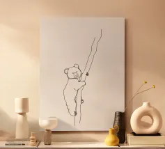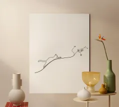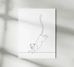 The playful and adventurous spirit of a cat hanging on a string with this minimalist line drawing. A modern abstract art piece that symbolizes curiosity, agility, and feline mischief.