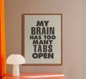 Inject some humour into your home or workspace with this witty art print, featuring the phrase “My Brain Has Too Many Tabs Open” in bold, stacked capital letters. The modern black typography pops against a warm grey background, making it a perfect conversation starter. Ideal for gifting to friends, colleagues, or students who appreciate a playful take on everyday chaos. This print adds a stylish, relatable touch to any interior and is great for birthdays, Christmas, or just because. Designed to stand out and bring a smile to your day.
