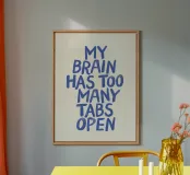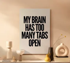 My Brain Has Too Many Tabs Open art print captures the modern dilemma of information overload. Hand-painted blue capital letters on a soothing beige background create a striking contrast, perfect for home or office decor. This witty, relatable piece speaks to anyone juggling multiple tasks and thoughts. Ideal for tech enthusiasts, busy professionals, or anyone seeking a humorous reminder to declutter their mind. High-quality print brings a touch of contemporary humour to any space, making it a conversation starter and a thoughtful gift for friends, family, or colleagues