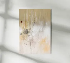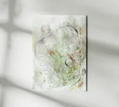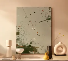 Soft washes of umber and moss green mingle with scattered splatters and brush trails, evoking the feel of pine needles and forest air. The minimal marks and tonal restraint create a meditative sense of organic rhythm and natural quiet.