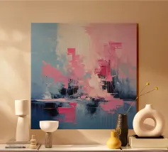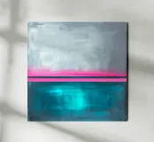 Teal and grey abstract painting with pink strip