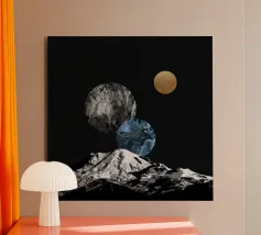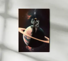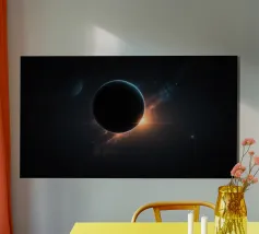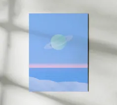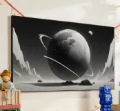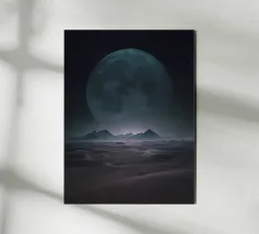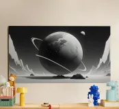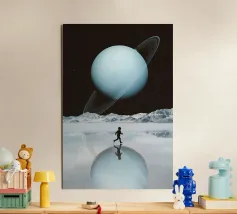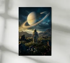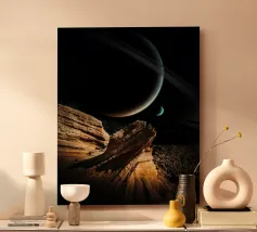 planet with rings hovering over a desolate landscape under a alu-dibond