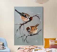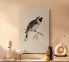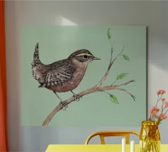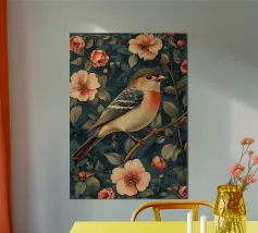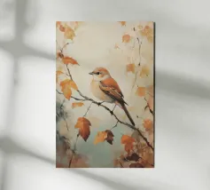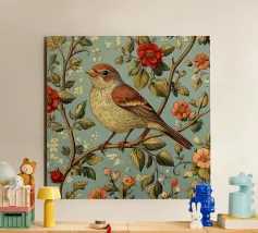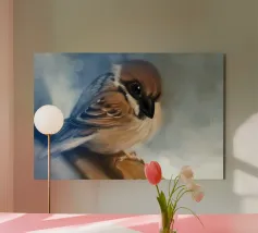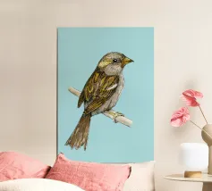 Sparrow perched on a branch with soft leaves in a calm alu-dibond