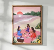 Three women enjoy a picnic on a blanket by the sea. Warm sunset hues and the surrounding serenity make the atmosphere magical and relaxed.