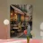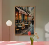 This captivating oil painting illustrates a cozy and timeless Parisian café scene. Elegantly attired patrons are seen enjoying drinks and conversations at round tables adorned with fresh floral arrangements. The golden glow of light radiates from within the café, casting reflections onto the cobblestone street. Striped awnings and intricate architectural details enhance the nostalgic Parisian charm, while the bustling yet intimate setting evokes the essence of classic European culture.