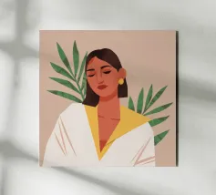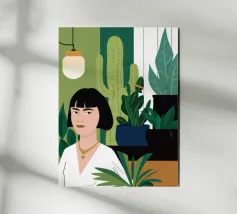 This motif exudes perfect Mediterranean lightness - a woman in white sits relaxed in front of oversized plants, reminiscent of ceramic vases in a pastel colour palette. The style is modern-naïve, inspired by the cut-outs of the late Henri Matisse and contemporary illustration art in a trendy boho style. The two-dimensional composition dispenses with depth but creates a soothing calm. Ideal for rooms that need to radiate serenity and gentle elegance.