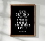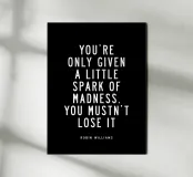 Elevate your space with this striking typography art print featuring Robin Williams' iconic words. The powerful phrase "You Are Only Given a Little Spark of Madness You Must Not Lose It" is elegantly rendered in crisp white modern sans-serif lettering against a deep black background. This high-contrast design creates a bold visual impact, perfect for home offices, living rooms, or creative spaces. A daily reminder to embrace your unique spark, this print inspires creativity and individuality. Ideal for fans of Robin Williams, comedy enthusiasts, or anyone seeking a touch of wit and wisdom!