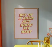 Bring a smile to your space with this playful art print featuring bold red and yellow retro 3D lettering on a soft pastel pink background. The phrase “Bit of a Mess But Doing my Best” captures life’s ups and downs with warmth and humour. Perfect for gifting to friends, students, or anyone who appreciates a touch of positivity and nostalgia. Its vibrant colours and vintage-inspired style make it an uplifting addition to any home or office, ideal for birthdays, Christmas, or just because.