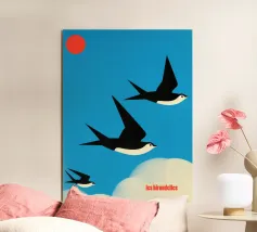 This work celebrates the elegance of simplicity. Two swallows, stylised into graceful, almost abstract forms, dominate the composition. The swallows are painted in a calming palette of light and dark blue, their surfaces characterised by a soft, painterly texture. The style is reminiscent of the two-dimensional aesthetics of Art Deco and the minimalist design language of Scandinavian Modernism. The light, neutral white background makes the birds and the powerful, coral-red ellipse behind them visually vibrate. A lyrical variation on love and affection.