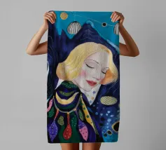 A delicate portrait of a woman with flowing blonde or light brown hair, her eyes closed or looking down, wearing an intricately detailed blue and silver or white garment suggesting lace or armor.