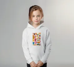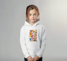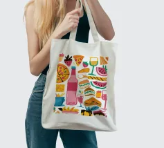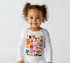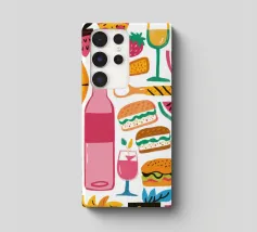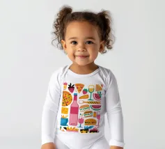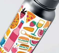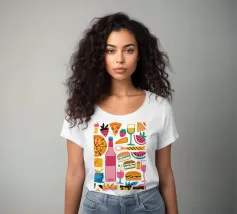 A vibrant and playful collection of pop art style fast food items, including a burger, hot dog, fries, and soda, scattered in a fun, chaotic pattern.