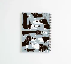 Various stylized dogs of different breeds and colors are playfully arranged in a repeating pattern against a light background. The illustration is fun, quirky, and celebrates canine diversity.
