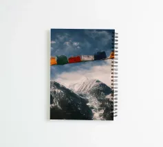 A powerful moment on the Annapurna Circuit: colorful Tibetan prayer flags flutter in the wind in the foreground, while snow-covered Himalayan peaks rise under a dramatic sky in the background. Each flag carries prayers meant to be spread by the wind—offering a spiritual contrast to the raw, majestic mountain landscape of Nepal.