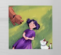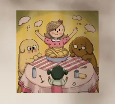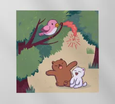 This artwork depicts a grumpy-looking cloud with a thought bubble containing a bird and a bear. The humorous and imaginative scene is set against a soft blue background.