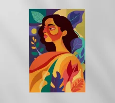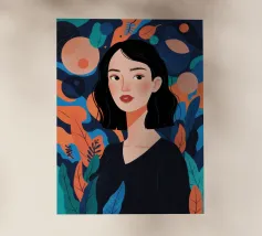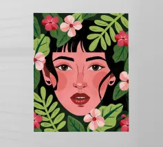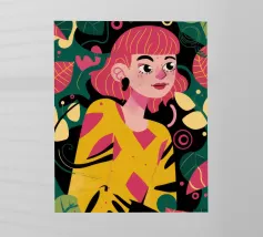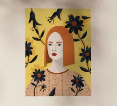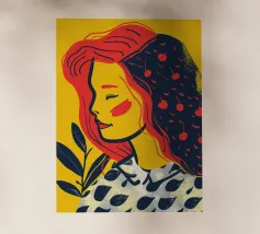 A portrait of a woman with flowing red hair, surrounded by stylized leaves and flowers, looking thoughtfully to the side. The style is modern, bold, and slightly art nouveau.
