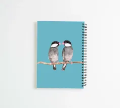 A watercolor drawing of two Java sparrows. They sit next to each other on a long stick and touch each other with the tips of their beaks.