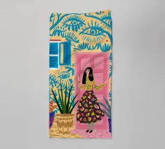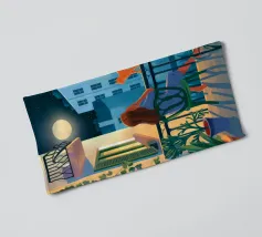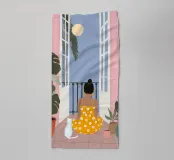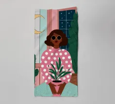 A quiet evening scene of a woman and her cat sitting by open doors, surrounded by lush plants and soft moonlight. The gentle composition feels dreamy and feminine with clean lines and pastel calm. Made to bring a little hush and slow living energy to your day.