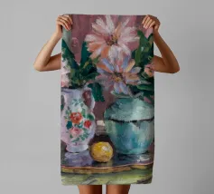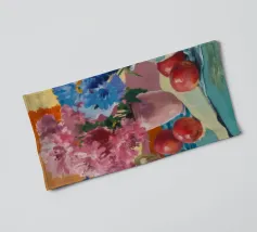 A bold still life featuring vibrant red-pink flowers, possibly poppies or geraniums, in a simple vase, alongside fresh green pears, all set upon a rich red tablecloth that contrasts sharply with a deep blue background.