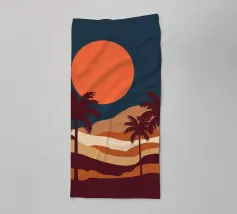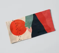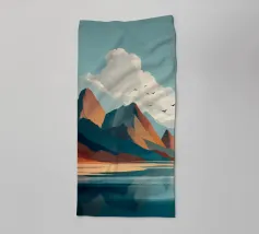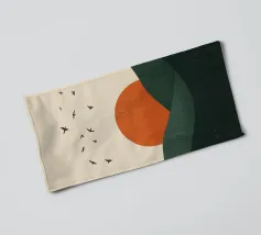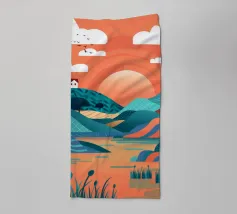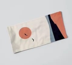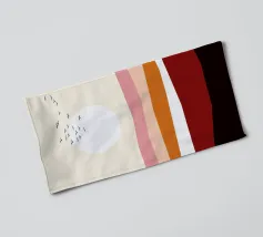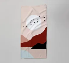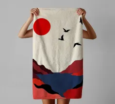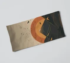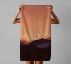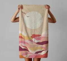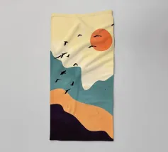 A serene landscape illustration of seagulls flying over a calm sea towards a setting sun, with mountains in the background, all in a soft, warm color palette.