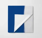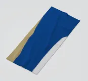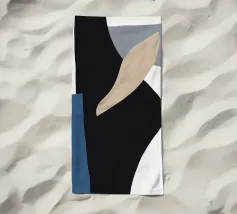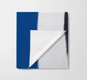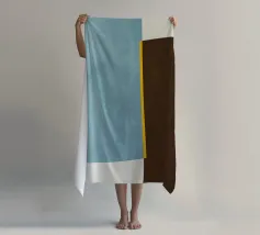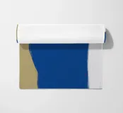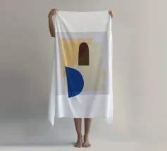 Several distinct shapes and colors dominate the composition, offering a minimalist and abstract aesthetic. A bold blue shape is juxtaposed with a tan form on the left and a white elongated form on the right.