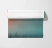 Soft hues of orange and teal blend seamlessly, creating a calming backdrop. Silhouettes of trees emerge from the mist, embodying a serene early morning atmosphere.