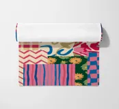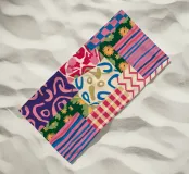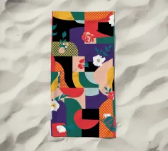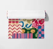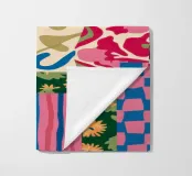An abstract pattern combines patchwork-like color blocks with energetic scribbles and stripes, creating a dynamic, playful, and artistic design.