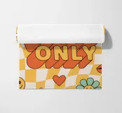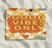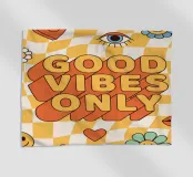 Fill your space with positivity and style with this "Good Vibes Only" digital art print. This vibrant graphic design features the uplifting message in layered orange text, set against a dynamic warped yellow and white checkered background, and surrounded by playful illustrations of smiling flowers, hearts, emojis, and other groovy symbols. It embodies a retro-inspired aesthetic designed to spread happiness and good vibes. This high-quality digital reproduction boasts a resolution of 7000x5000 pixels at 300 dpi, ensuring outstanding clarity, sharp lines, and brilliant colors. An ideal print for