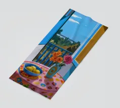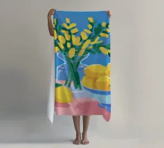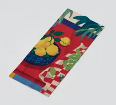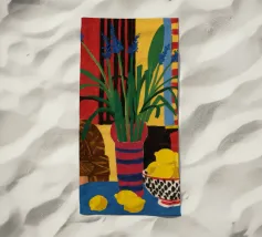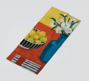 An inviting still life on a bright red table, featuring a bowl of lemons and a blue vase holding delicate white flowers. The warm yellow background enhances the cozy and vibrant atmosphere.