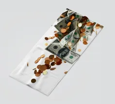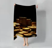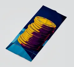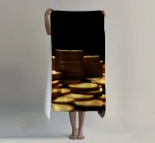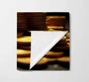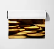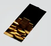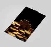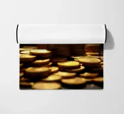 Piles of shiny coins are arranged in varying heights, surrounded by scattered coins, all illuminated against a black background, creating an eye-catching contrast.