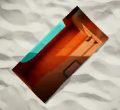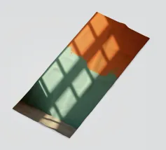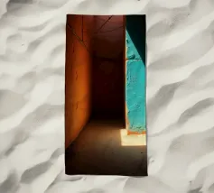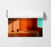 Soft sunlight filters through a turquoise window, casting shadows on orange walls. A clay pot sits on the wooden floor, enhancing the artistic ambiance of the space.