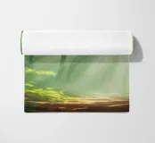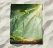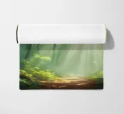 Dappled sunlight streams through the trees of a verdant forest, illuminating the path below and highlighting the rich green foliage. The air is fresh and inviting, perfect for exploration.