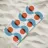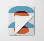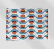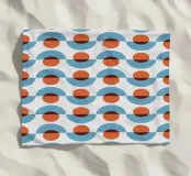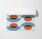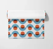 A repetitive geometric pattern features alternating rows of semicircles and circles in blue and rust colors against a light background. The design creates a sense of rhythm and movement through its symmetrical arrangement.