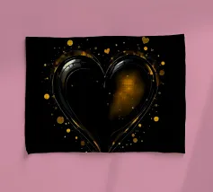 Pink Heart Art Print with Glitter and Gold Accents - This visually stunning artwork features a glittering pink heart in a glass-like surface surrounded by gold leaves and translucent bubbles. The vibrant pink and gold colours combined with soft lighting create a dreamy, romantic atmosphere. The intricate details and reflective textures of the artwork make it a perfect gift for lovers of modern, whimsical decor and romantic art.