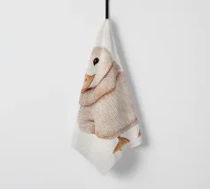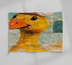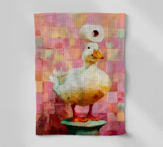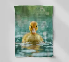 A cute duckling is peeking out from under a soft white towel. Its fluffy yellow feathers and inquisitive eyes create an adorable and charming scene.