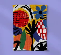 A beautiful patch of whimsical, stylized wildflowers is illustrated in a charming, folk art inspired style, with a delightful mix of colors and shapes that radiate joy and natural beauty.