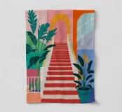 Vibrant red stairs lead upwards through a colorful, simplified building towards a lush, arched entryway, suggesting a journey towards a beautiful and exotic destination.