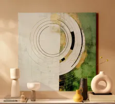 This artwork is an abstract composition in panoramic format, characterised by a dynamic mix of textures, colours and geometric shapes. Concentric golden circles create a sense of movement and depth. The texture is rich, with visible brushstrokes and layers of colour that create a special atmosphere. The interplay of green and earth tones with metallic accents gives the work a harmonious yet vibrant energy.