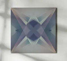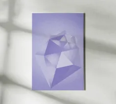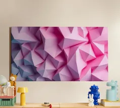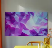 Vibrant abstract composition showcases a blend of purple and blue hues, forming sharp geometric shapes and smooth transitions that create depth and movement.