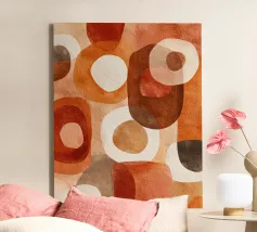 A sophisticated abstract pattern combining botanical leaf motifs with art deco geometric shapes in warm earthy tones of rust orange, burnt sienna, grey, and cream. This artistic design merges organic floral elements with modern geometric forms for a refined, vintage-modern aesthetic. Perfect for art deco lovers, abstract art enthusiasts, earthy tone fans, and anyone who appreciates the elegant fusion of botanical and geometric design with warm, natural colors.