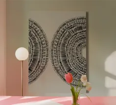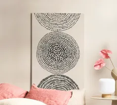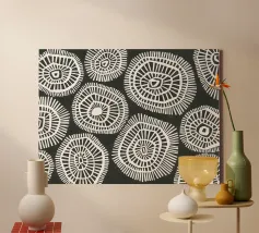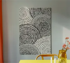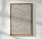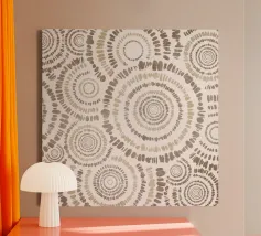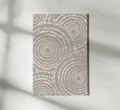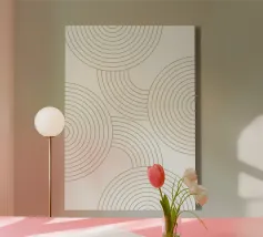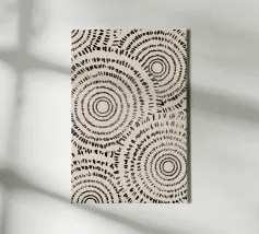 Captivating abstract design featuring a pattern of concentric circles filled with short, white, dash-like marks radiating outward against a beige background, creating a visually engaging and almost hypnotic effect.