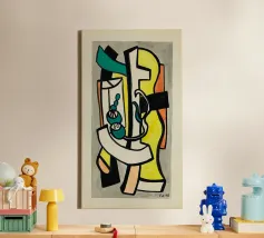 This highly abstract tapestry by Fernand Léger showcases his characteristic use of strong black outlines and bold primary and secondary colors. The composition features thick, winding forms reminiscent of a treble clef or musical notation, set against blocks of color and white brick-like patterns. The work reflects Léger's lifelong exploration of pure form and color.