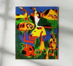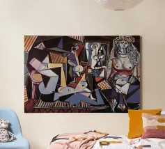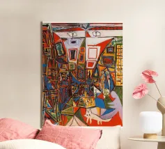 This vibrant and complex abstract painting showcases a dynamic Cubist composition with fragmented human figures and architectural elements. Rendered in a bold palette of blues, yellows, oranges, and purples, the artwork features interlocking shapes, distorted perspectives, and expressive lines, creating a sense of chaotic energy and emotional depth. The intricate details and contrasting colors invite the viewer to explore the multifaceted narrative within the piece. This high-quality digital poster (7000x5000 pixels, 300 dpi) magnificently captures the intellectual depth and artistic genius of