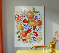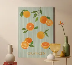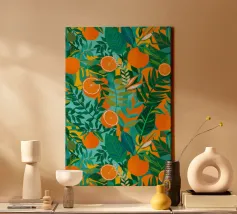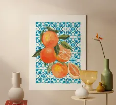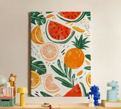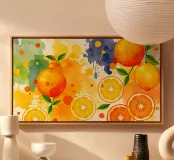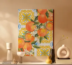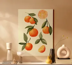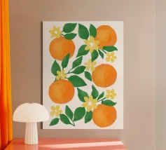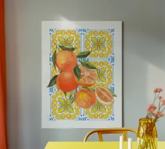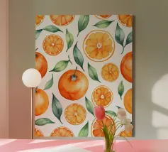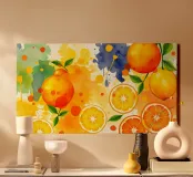 Brightly colored oranges and lemons are depicted against a backdrop of splashes and dots in various shades, creating an uplifting and playful atmosphere that invites joy.