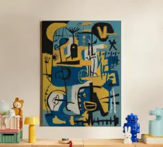 This vibrant and energetic abstract expressionist painting features a dynamic interplay of forms, colors, and textures, creating a sense of controlled chaos. Bold brushstrokes in blue, black, white, and orange dominate the canvas, with hints of yellow and green in the background. Recognizable elements, such as what appears to be a butterfly and fragmented facial features, emerge from the abstract composition, inviting multiple interpretations. This high-quality digital poster (7000x5000 pixels, 300 dpi) perfectly captures the raw emotion and spontaneous energy of abstract expressionism, making
