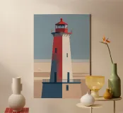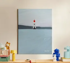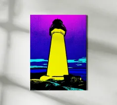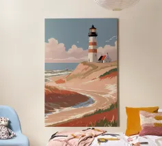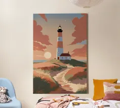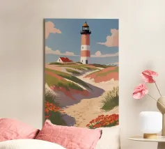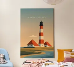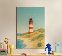 This modern illustration of the Hörnum Lighthouse takes a unique approach to color and form, creating a minimalist yet powerful visual impression. The structure’s red-and-white hues are juxtaposed against a carefully composed background of soft blues and sandy neutrals, mimicking the tones of the North Sea’s coastal landscape. With its clean lines and abstract influence, this piece captures the spirit of Sylt’s maritime culture in a timeless and contemporary fashion.