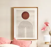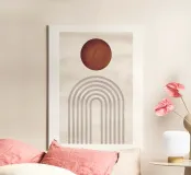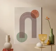 This abstract design in warm earthy tones features a stylised sun over a gentle arched pattern that creates a calming and harmonious atmosphere. The minimalist combination of circular and linear shapes lends any room a modern boho aesthetic while radiating calm and clarity. Whether as a wall mural, mug, cushion or mobile phone cover - this motif is perfect for lovers of modern, minimalist art who want to bring a natural and stylish touch to their home. Ideal for the living room, bedroom or office.