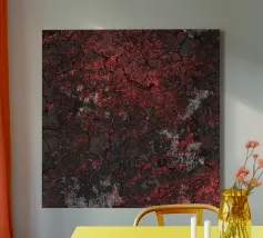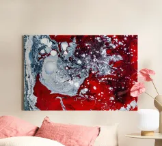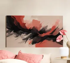 Bold black and red paint splashes cover a dark surface, creating an abstract design. The contrasting colors emphasize texture and depth, enhancing artistic expression.