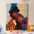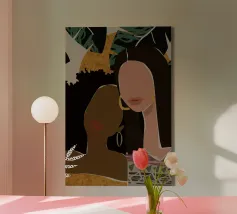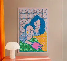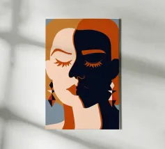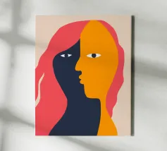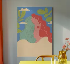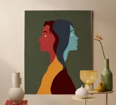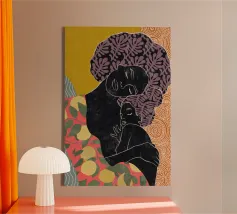 This painting portrays two individuals with intertwined hair and abstract patterns in the background. The use of bold colors and geometric shapes creates a sense of unity and fusion.