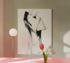 Meet Alan, with his sweeping, slender silhouette. Hinting at secret sprints and nervous curiosity, his head, perched high above, sports ears askew in mid-listen, while the elongated legs give him a slightly gawky, loveable grace. Alan’s monochrome fur and upright poise capture both his gentleness and loyalty — a charming fellow caught in the midst of eager anticipation!