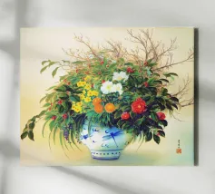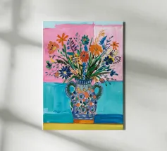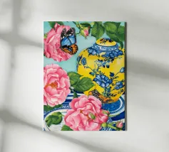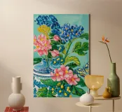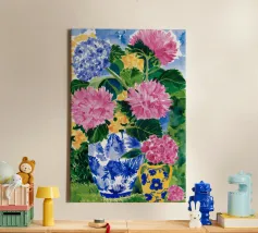 A vibrant still life featuring a blue and white patterned vase overflowing with blue hydrangeas and other flowers, with butterflies, against a bright turquoise background.